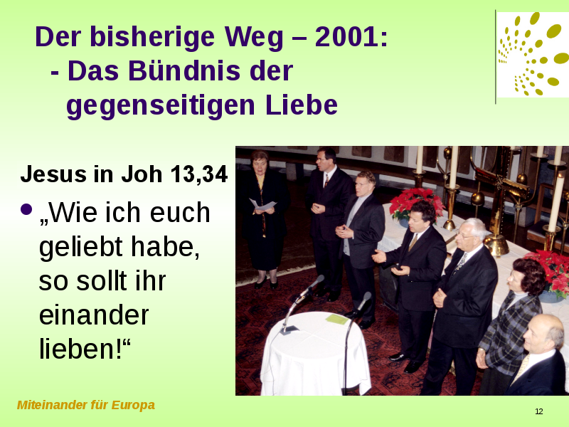Wir wollen uns heute wieder auf das „Neue Gebot verpflichten. Es kennzeichnet den gemeinsamen Weg christlicher Bewegungen, Gemeinschaften und Gruppierungen und ist von Anfang an das tragfähige Fundament unseres Miteinanders. Wir verpflichten uns in Freiheit neu, indem wir die Worte Jesu aus dem Johannesevangelium hören und in unserem Herzen ein uneingeschränktes Ja dazu sagen.
