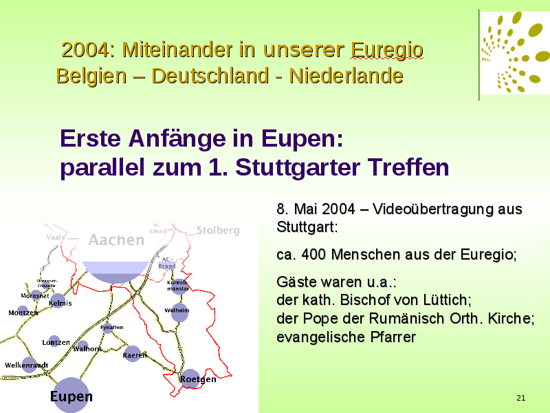 "Schon beim 1. Europatreffen im Mai 2004 in Stuttgart wurden viele Begegnungen in zahlreichen Städten parallel vorbereitet und ich hatte die Gelegenheit grenzübergreifend mit Menschen verschiedensten Bewegungen in der Equipe in Eupen mit zu arbeiten. Wir haben uns viele Male getroffen und gemeinsam entdecken dürfen wie so ein Tag vor Ort aussehen könnte. Mich hat damals besonders die viel größere Bescheidenheit unserer belgischen Nachbarn beeindruckt, die sehr viel weniger Ansprüche auf das Äußere legten und mehr auf die inneren Werte bedacht waren. Das habe ich heute noch sehr lebendig in Erinnerung und noch so manche Male als Beispiel in mir bewahren können! Die Unterschiedlichkeit der einzelnen Bewegungen kam deutlich zum Tragen – aber auf eine beschenkende Weise, die niemanden ausschloss, sondern stets bereicherte. Der Wunsch zu einer echten Geschwisterlichkeit, die von Jesus gezündet ist kam intensiv zum Ausdruck – war Mosaikstein zu der Vielzahl von Veranstaltungsorten, die dieses Zeugnis christlichen Lebens für Europa lebten!"