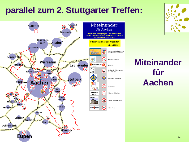 Als Vorbereitung auf den Kongress 2007 in Stuttgart entstand die Initiative, die nun aus 15 Geistlichen Gemeinschaften besteht, unser: